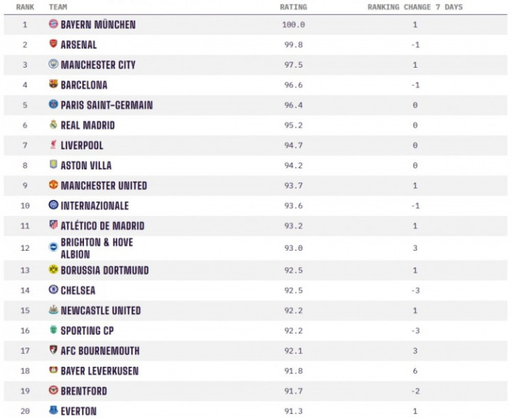 直播吧4月13日讯著名数据机构OPTA对全球超过10000家俱乐部打造了一个评分系统,评分范围从0到100。其中,0分代表全球最弱的球队,而100分则代表全球最强的球队。在OPTA全球俱乐部实力榜中,拜仁、阿森纳、曼城、巴萨以及巴黎圣日耳曼位居前五。