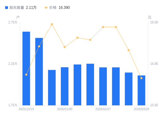 日期 A股户数(户) 流通A股户均持股数(股) 户均持股市值(万元) 2025-12-31 25790 9171.75 15.17 2025-12-19 26393 8895.67 14.67 2025-12-10 28395 8268.47 13.97 2025-11-28 24836 9453.35 17.29 2025-11-20 25455 9223.47 16.93 2025-11-10 22935 10236.90 18.12 2025-10-31 23441 10015.93 17.48 2025-10-20 22817 10289.84 17.31 2025-09-30 22709 10352.84 18.02 2025-09-19 21964 10704.00 18.35